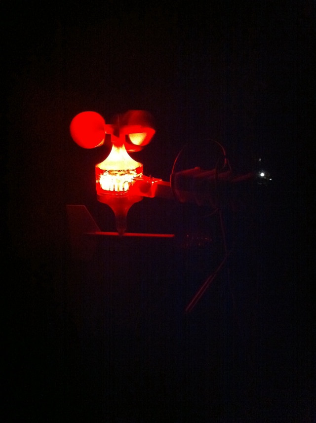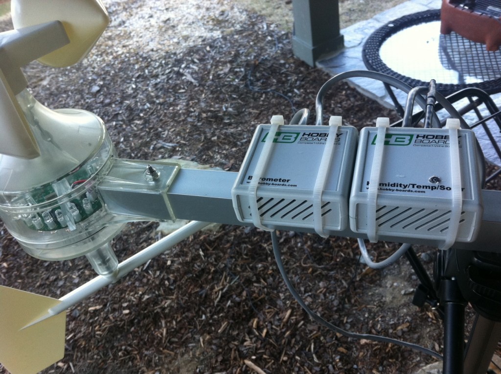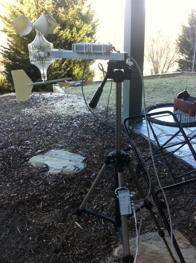 I mounted all of these devices, excepting the rain gauge, on to a camera tripod, which can be collapsed in to about 3′ of height and 5″ of girth, and can be easily stowed inside the trunk or back seat of a vehicle. I can deploy this if the situation allows for it, and read the data with my Netbook while in a mobile storm chasing scenario, or if I just want to read the weather data for where I am a particular day, before flying RC planes or kites.