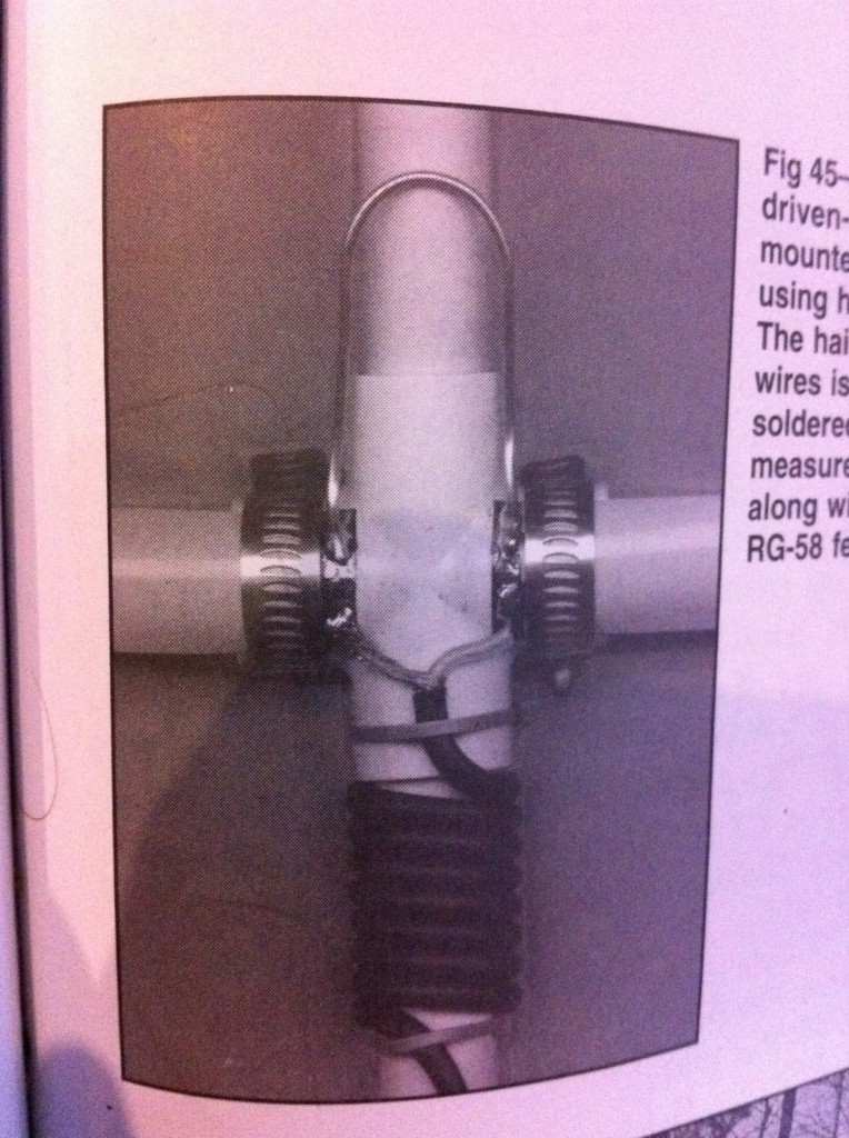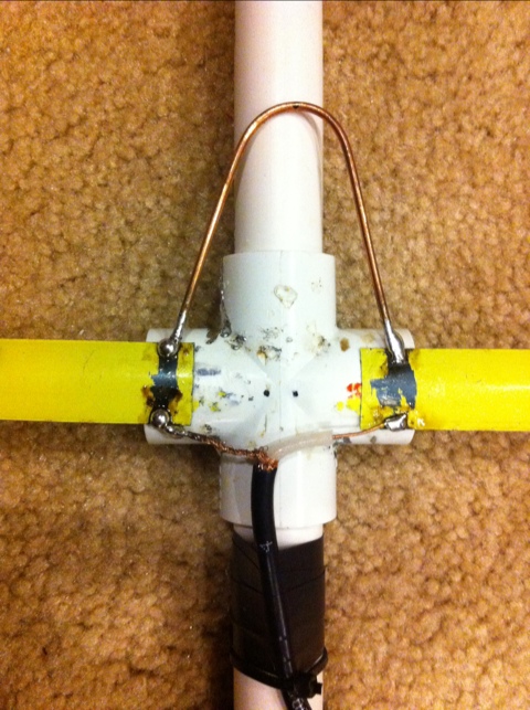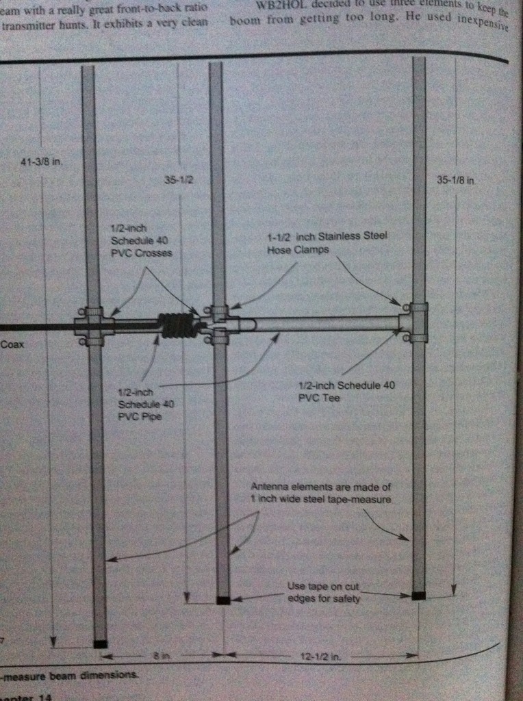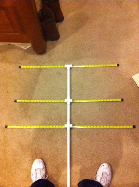 The directions are in the ARRL Antenna Book, and I followed those plans pretty closely. The method is simple. Cut the PVC pipe 11.5″ back from the end, then 7″ back from the new end. This will give you your element spacing. Connect the pieces back together (in the order that you cut) via the PVC crosses. Gluing is unnecessary. Put the PVC tee on the end. Then, cut the tape measure in to the elements with your scissors or shears. Refer to the diagram for the dimensions of each element. Remember to pay attention to the fact that the driven element will be cut in the middle and have a spacing between each side. The diagram shows a measurement for the overall length of the element, including that gap. After you cut each element, be sure to cover the ends with electrical tape. They’re quite sharp.