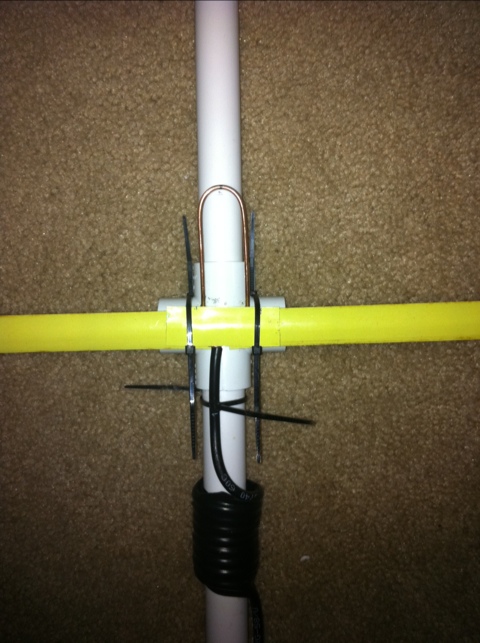 I accidentally bought 1/2″ hose clamps instead of 1-1/2″, so I opted to use super glue instead. Glue or clamp your director and reflector in place on the crosses. Find the center of your driven element and cut it in two. Now you want to use something sharp to scrape the paint off of the ends of the elements. I found it easier to do this after they were glued in place. If you’re using glue, glue them with a 1″ gap between them. Then scrape the paint off of the ends at the gap, so your coax will make a good electrical connection. I used excess measuring tape and cut about 2″ to use as a means of securing the coax and the matching section to the measuring tape. I put this over the coax and matching section like the top slice of bread in a sandwich. Zip ties were used to then hold the top slice of bread measuring tape down and, subsequently, the coax and measuring section as well. (Refer to the picture below to see how it turned out for me.) I also used zip ties to hold the coax in place temporarily. Once I have the SWR matched properly, I will attempt to solder the matching section and coax to the measuring tape directly, with flux paste.